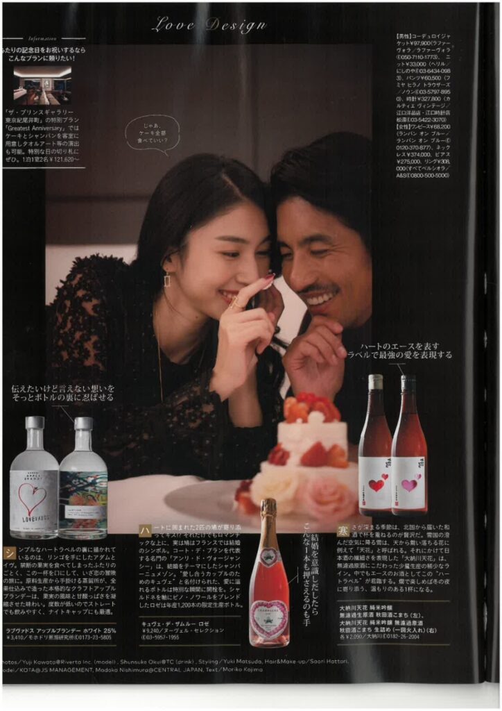 東京カレンダー2月号(12月19日発売)に弊社エース商品「大納川天花 純米吟醸 無濾過(生)原酒ハートラベル」を取り上げていただきました。甘酸っぱい初恋の味わいが楽しめるハートラベルは特集ページのタイトル「愛の冬酒」にぴったりの日本酒です。皆様もこの機会に是非「大納川天花ハートラベル」と共にお過ごしくださいませ。
